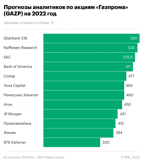 Опрошенные Refinitiv аналитики, среди которых эксперты «ВТБ Капитала», SberCIB, «Атона», Bank of America и Raiffeisen Research, ожидают роста цены бумаг до ₽423 за акцию в течение 12 месяцев — то есть еще примерно на 33%. Среди опрошенных экспертов 11 рекомендуют покупку акций, а двое советуют держать бумаги в портфеле. Наибольший потенциал роста в бумагах «Газпрома» видят аналитики SberCIB — они оценивают справедливую стоимость акций газовой компании на уровне ₽550 в перспективе 12 месяцев. Аналитики Bank of America считают,