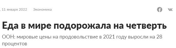 Сильный двузначный рост цен на продукты питания в 2021 году наблюдался в мировых масштабах. Продовольственная и сельскохозяйственная организация ООН (ФАО) констатирует, что за 2021 год мировые цены на продовольствие выросли на 28,1%, и это самое масштабное подорожание за все последние годы. На протяжении 2021 года фиксировались и более высокие показатели, например по соотношению сентябрь к сентябрю подорожание составляло вообще треть - почти 33%. Цены на злаковые культуры выросли, в среднем, на 27,2% - это рекордный показатель с 2012 года. По отдельным видам зерновых цены повысились сильнее: на кукурузу - на 44,1%, а на пшеницу - на 31,3%. Единственной злаковой культурой, цены на которую за год снизились, стал рис - он подешевел на 4%. Больше всего подорожали растительные масла (65,8% за год) и сахар (37,5%) за год. Молочная продукция подорожала, в среднем, на 16,9%, а мясная - на 12,7%. Наверное, глядя на эти цифры и вспоминая свои походы в магазин годичной давности, россияне могут п