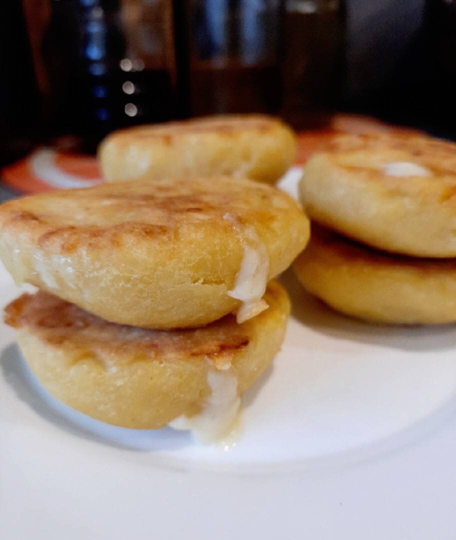 #кукпад4 С Днём рождения! Процветания, всех Благ создателям и участникам сайта. Маленькие кукурузные лепешки характерны для Колумбии и Венесуэлы. Готовить их можно без начинки и с начинкой. Данный рецепт с сыром. Моя семья оценила и всем понравилось. С молоком уплетали за обе щеки. Будем с дочкой готовить их чаще. #арепы #кукурузныелепешки #лепешки #колумбийскоеблюдо #пп #зож #Сыктывкар Ингредиенты: гр Мука кукурузная, гр Мука пшеничная, Вода теплая, Соль, гр Масло сливочное, гр Сыр твердый, Начинка, по вкусу Сыр твердый Способ приготовления: Муку кукурузную и пшеничную просеиваем. Добавляем воду. Замешиваем. Добавляем размягченное сливочное масло и соль. Замешиваем. Натираем на крупной терке сыр и снова тщательно замешиваем. Тесто получается очень мягкое и эластичное к рукам не прилипает. Тесто разделила на 11 равных частей. Нарезаем сыр для начинки. Берем часть теста и катаем шарик и делаем лепешку, кладем кусочек сыра и заворачиваем его вовнутрь лепешки. Лепешки получаются примерно