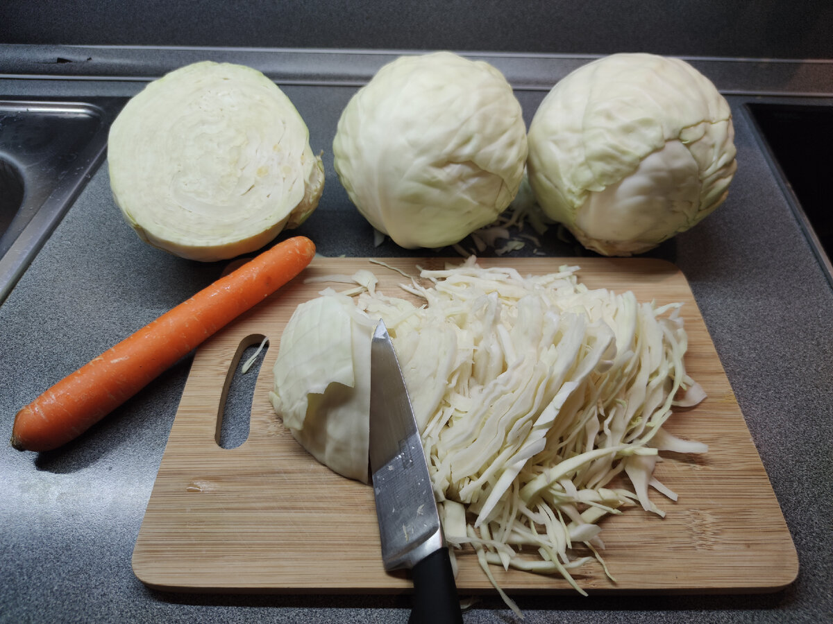 Капустка - хороша закуска. И подать не стыдно и съедят - не жалко. Фридрих Ницше :-) На 3-хлитровую банку в идеале нужен кочан капусты весом 3 - 3,5 кг. Чем белее, плотнее и сочнее кочан - тем лучше. В моём случае Бог послал в "Пятёрочку" завезли только маленькие кочанчики. Взял три штуки общим весом 3,5 кг. Режем капусту вот так: Когда с капустой покончено, берём крупную морковь и трём её на тёрке: Далее берём крупную НЕ!йодированную соль (помол №1) из расчёта на каждый килограмм капусты 20 граммов соли. В моём случае на 3,5 кг капусты пошло 70 г соли. Морковь на капусту, соль на морковь И перемешиваем Далее этот микс набиваем в 3-хлитровую банку. Сразу всё не запихиваем. СЛО-Я-МИ!!! Каждый слой трамбуем толкушкой для картофеля. Вот, набил под завязку 3,5 кг: Следующий этап: Банку в кастрюлю (чтобы сок, который попрёт во время брожения не оказался на полу) и на трое суток в темное место, а сверху ставим гнёт (у меня это пластиковая бутылка 0,5 л с водой). Раз в день достаем, проты