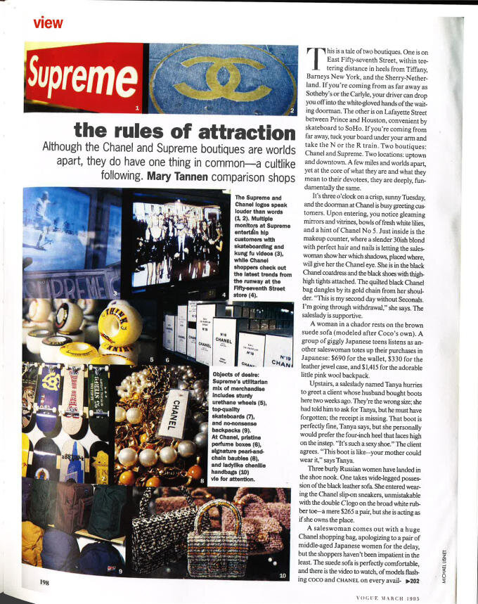 Сегодня, когда Supreme известен на весь мир, сравнение вещей марки с продукцией модных домов на страницах Vogue не покажется чем-то странным. Тем не менее, подобное случалось уже в 1995 году – году, когда Vogue не то, чтобы писал об уличной одежде. Тогда редакция журнала посетила бутик Chanel и нью-йоркский Supreme, чтобы сравнить культуры вокруг брендов и их фан-базу. Мы же в свою очередь нашли статью и перевели основные моменты. "Подумайте о Chanel. Что определяет подобный бренд? Сложность в приобретении их вещей? Безусловно, вещи их непомерно дорогие, и даже самый маленький аксессуар стоит несколько сотен долларов. Легко распознаваемый логотип? Отзеркаленные «С» моментально приковывают к себе взгляд, где бы они не находились, – будь то аккуратный и эстетичный Париж или яркий Токио. Тем не менее, вышеназванные атрибуты работают лишь потому, что Chanel <на тот момент было - прим. ред.> ни много ни мало восемьдесят лет. Supreme же недавно исполнился всего год. И, учитывая этот факт, ка