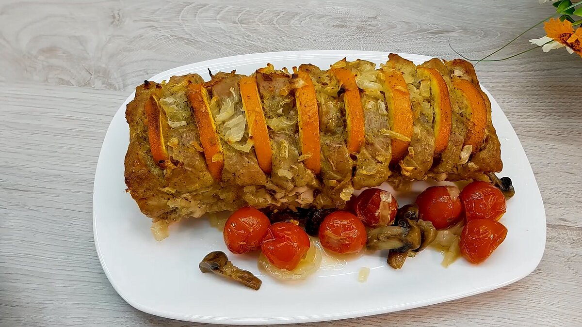 Что может быть лучше, чем вкусный ужин вместе со своей семьёй? Главным блюдом должно стать свинина с апельсинами, приготовленное по данному рецепту. Нежное и сочное мясо порадует абсолютно каждого. Данное блюдо обладает невероятным вкусом. Рецепт приготовления крайне прост, а готовка не займет много времени и доставит максимум удовольствия. Ингредиенты: Свинина с апельсинами рецепт приготовления Сделать надрезы на всём куске мяса, практически полностью его разрезая (если есть жировая прослойка, то смело надрезать до неё) Разрезать луковицу на 2 половины. Одну из них убрать в сторону (она понадобится позже). А другую половину нарезать полукольцами. Смазать противень растительным маслом и выложить на него нарезанный лук. Затем положить на противень мясо. Нарезать апельсин полукольцами, и положить дольки в разрезы мяса. Смешать соль, перец и 1 чайную ложку американской горчицы. Добавить 40 мл оливкового масла. Всё тщательно перемешать. Смазать мясо полученным соусом (промазать необходимо