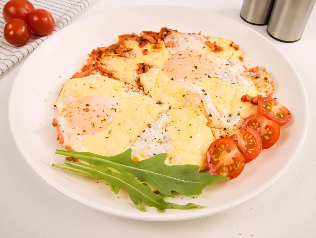 Яичница — это вкусное и питательное блюдо, которое прекрасно подходит для завтрака. А все потому что оно очень быстро и просто готовится и отлично насыщает. Приготовьте яичницу с колбасой и сыром по этому рецепту, и вы останетесь довольны. Для ее приготовления возьмите любую вареную колбасу, либо замените ее на копченую колбасу, бекон или ветчину. ПРОДУКТЫ для блюда на 2 порции Куриное яйцо 4 шт. = 240 г Вареная колбаса 200 г Твердый сыр 200 г Кетчуп 2 ст. л. = 50 г Сушеные травы 2 щепотка = 4 г Соль по вкусу Черный перец молотый по вкусу Растительное масло по вкусу СДЕЛАТЬ ПОЛЕЗНЕЕ Замените колбасу на отварную курицу. Вместо кетчупа используйте томатную пасту или свежие помидоры. ПОШАГОВЫЙ ФОТОРЕЦЕПТ ПОДГОТОВИТЬСЯ Помойте куриные яйца. Колбасу очистите от упаковки. Сыр для блюда возьмите любой по вашему вкусу, например, голландский или костромской. Подготовьте остальные ингредиенты. НАЧАТЬ ГОТОВИТЬ 1. Нарежьте сыр тонкими ломтиками. 2. Колбасу нарежьте небольшой соломкой. 3. Разогрейт