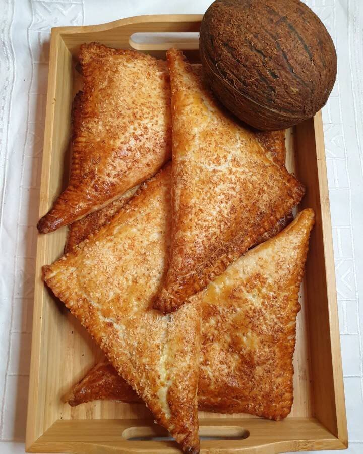 #кукпад4 Ингредиенты: Слоёное дрожжевое тесто;, Масса творожная сладкая с курагой 4,5%;, Биотворог 5%;, Яйцо;, Корица;, Кокосовая стружка;, Изюма ;, Сахар Способ приготовления: Приготовить все ингредиенты. Приготовить начинку. Изюм промыть и залить кипятком на 15-20 минут. Взять ёмкость, поместить туда творог, изюм, одно яйцо, по желанию добавить сахар или сахарную пудру, все перемешать. Освободить тесто от упаковки и разморозить при комнатной температуре в течение 60 минут. Разрезать на шесть квадратов, раскатать слегка просыпаясь мукой, чтобы не рушить его структуру. Сформировать изделия. Поверхность готовых изделий смазать взбитыми яйцом и посыпать кокосовой стрижкой. Поставить в тёплое место на 30-40 минут для увеличения объёма. Нагреть духовку до 180⁰. Выпекать изделия до образования румяной корочки, примерно 15-20 минут. Приятного аппетита!