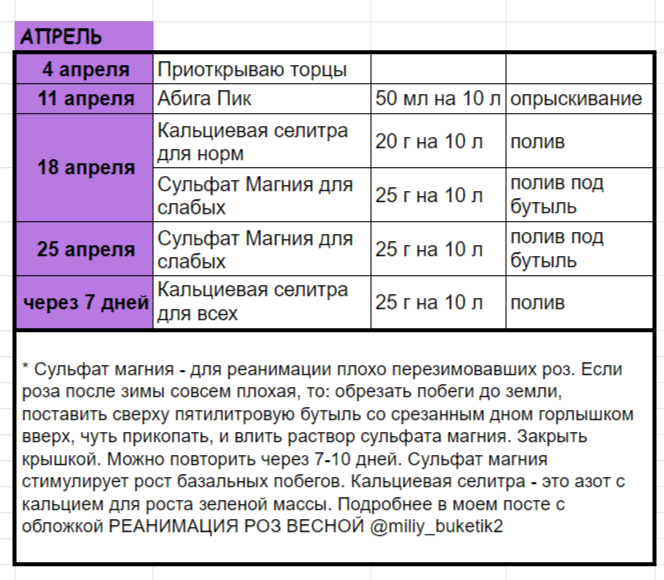 Продолжаю публиковать шпаргалки по уходу за розами. Это моя схема 2021 года. Напоминаю, что нельзя слепо копировать чей-то опыт, всё сады разные и уникальные, и только вы знаете, что надо вашим розам. А ещё очень разные климатические условия, погодные, к ним тоже надо приспосабливаться. Так, например, если у вас льют дожди - то опрыскивать бессмысленно, но хорошо подкармливать под корень. И наоборот - по сухой погоде отлично заходят именно баковые смеси. Конечно, использование химии в саду должно быть осознанным. Нельзя поливать и опрыскивать бездумно. Надо знать каждый препарат "в лицо", благо, информации море. Прежде, чем использовать что-то - читайте, вникайте, спрашивайте. Да, это сложно. Я сама лет 10 принципиально не использовала химию. Потом несколько лет потратила на понимание. И сейчас знаю, что без химии сад не просуществует десятки лет. Но главное - понимание. Возьмите за основу простые правила: Розам нужны 🍷удобрения (подкормки) 🍷защита от болезней (фунгициды) и вредит