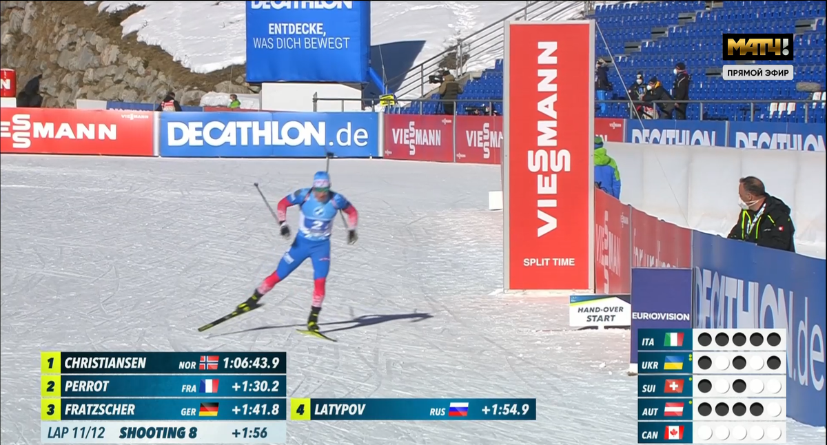 У сборной Норвегии выступал сильнейший состав: Легрейд Стурла Хольм, Бё Тарьей, Бё Йоханнес, Кристиансен Ветле, который порвал всех, опередив нашу сборную почти на две минуты, допустив всего четыре промаха. Практически идеальная работа! У нашей сборной состав был экспериментальный: на первый круг поставили запасного Бабикова, на второй – молодого Серохвостова, на третий – опытного Логинова, а на последний – только-только вышедшего из карантина Латыпова.