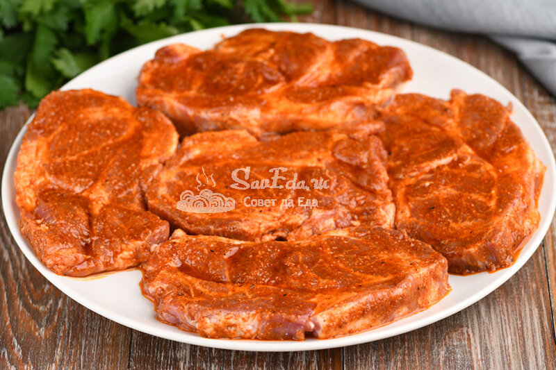1. Мякоть свинины (у меня шейка) разрезаем на 5 кусков и посыпаем солью. Отбивать их не надо.