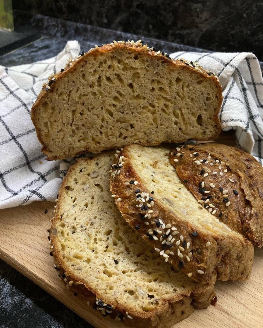 Ингредиенты: сыра, миндальной муки, муки из псиллиума, яиц, разрыхлителя, Соль, Семена чиа, семян подсолнечника, Кунжут для посыпки Способ приготовления: Сыр натереть на тёрке. Смешать все ингредиенты. Переложить в форму (у меня силиконовая для кулича). Дать тесту постоять 15 минут. Выпекать в разогретой до 180 С духовке 50 минут. Оставить остывать в духовке. Приятного аппетита 😋!