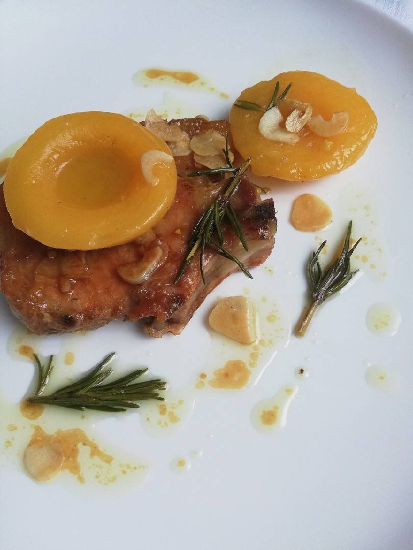 Свиная корейка с персиками, чесноком и розмарином