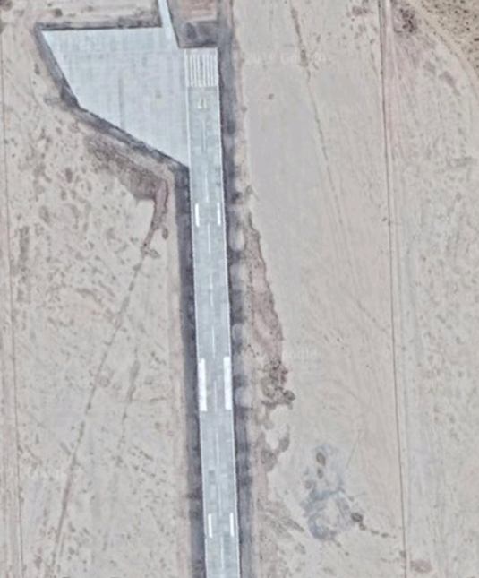 Похоже, что аэродром не эксплуатируется или находится в режиме ожидания, т.к. на полосе не видно следов от шасси приземляющихся самолетов, а радиолокационная разведка не фиксирует здесь полеты летательных аппаратов. Однако, ВПП кем-то регулярно очищается от песка. Настораживает и расположение коммуникаций и строений аэродрома не характерное для стран бывшего СССР. Отсутствуют: башня пункта диспетчерского управления, рулёжные дорожки, самолетные стоянки, т.е. практически - это аэродром для одного или максимум двух самолетов. Но имеются устройства похожие на солнечные батареи и металлические шары неизвестного предназначения. Не видно и каких либо подъездных путей к аэродрому, но видны несколько укрытий (типа бункеров), ангаров и мастерских, а так же ветка ЛЭП идущая в пустыню. На первых же снимках были явно видны модульные "домики", какие-то машины, контейнеры, строительный мусор.
