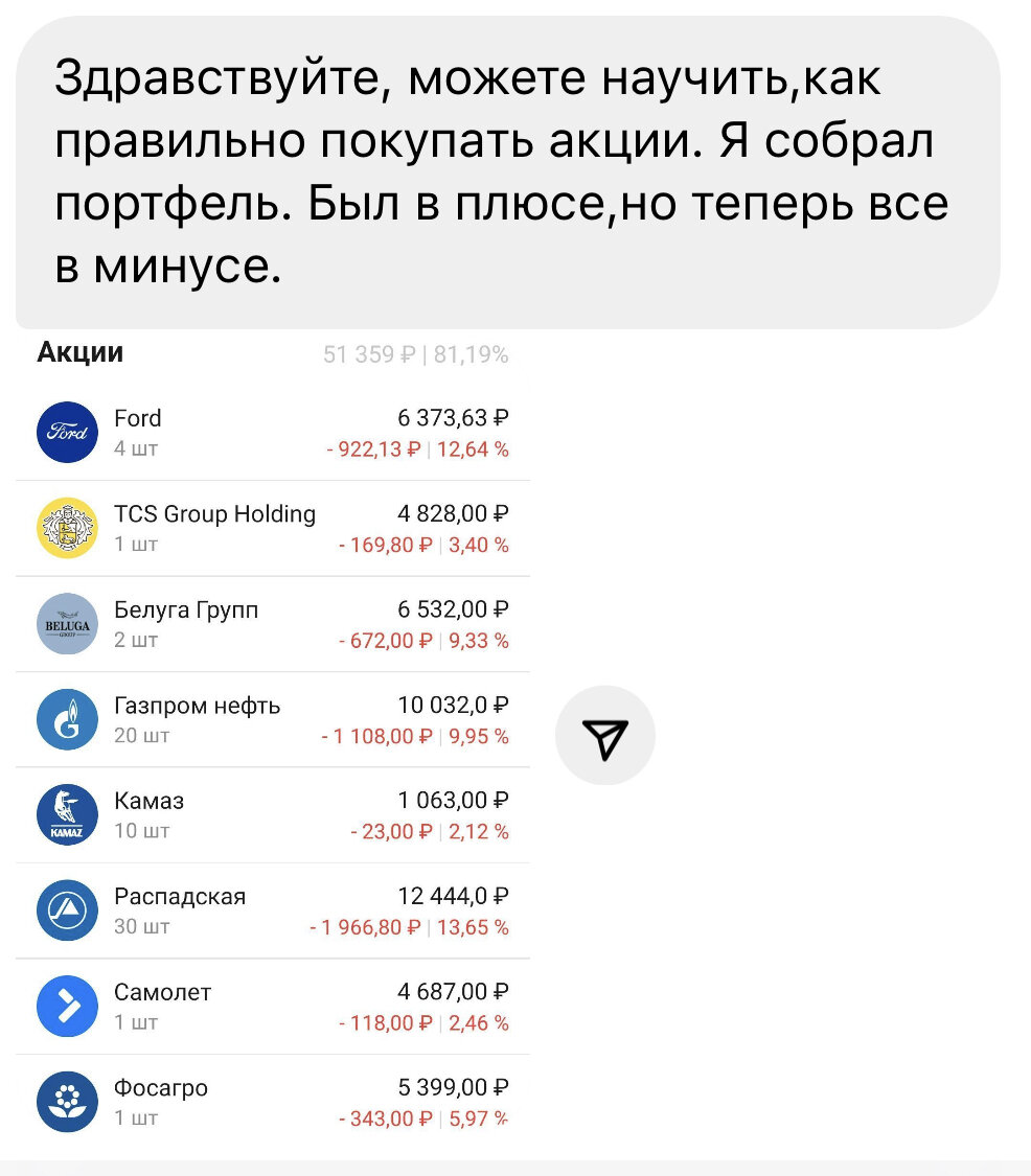 Чаще всего начинающий инвестор решает сам начать путь инвестиций и покупает то, что на слуху. Иногда акции падают сразу, иногда должно пройти время, но результат инвестиций без знаний всегда один - потеря денег. Начнем с того, что данный инвестор думает, что портфель всегда должен расти и уход его в красную зону означает потери денег. Это не так.
