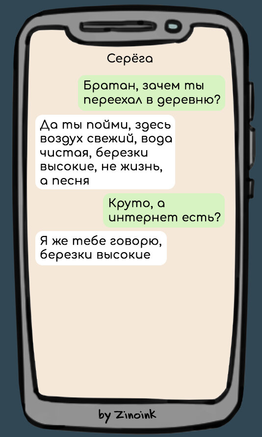 Привет, дорогой друг! Надеюсь, ты готов ворваться в новую неделю на полной мощности, чтобы получить крутые результаты. Если пока что ты только разгоняешься и приходишь в рабочее состояние, у меня есть отличное топливо, которое добавит тебе энергии, — это новые шутки и #юмор . Сегодня я подготовил #смс переписки , в которых мы увидим один очень давний и можно даже сказать вечный конфликт. Не такой вечный как конфликт отцов и детей, но все же. Я предлагаю тебе почитать #сообщения , в которых друзья и знакомые пытаются решить, где круче жить: в деревне или в городе? Поскольку ситуация в экологии очень сильно влияет на самочувствие и здоровье человека, то многие перебираются поближе к природе, чтобы снизить влияние различных производств. Однако, отсутствие в сельских регионах большого количества технологических решений может помешать комфортной жизни. В наше время сложно встретить человека, у которого не было бы аллергии. Думаю, это связано не с самой приятной экологической ситуацией, поэт