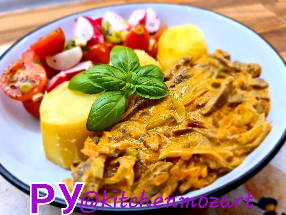 Свиной язык🐷👅 по своей полезности значительно превосходит мясо. Волокна языка насыщены минеральными веществами, которые обеспечивают развитие костной и мышечной системы и необходимы при железодефицитной анемии. Поэтому данный субпродукт первой категории нужно употреблять в пищу как можно чаще, особенно детям👫 и людям пожилого возраста👴👵 Предлагаю вам очень вкусный рецепт😋Для этого блюда подойдет не только свиной🐷, но и говяжий🦬 или телячий🐮 язык. Перед тушением язык отваривают до готовности и снимают верхнюю пленку. После тушения язык получается очень нежным и мягким. Ничего лишнего, при этом очень вкусно!😋 Ингредиенты: Язык свиной отварной 👅нарезать полоской, Лук репчатый 🧅нашинковать, Чеснок 🧄измельчить, Морковь 🥕натереть на крупной терке, Масло для жарки, Вода 🥛, Томатная паста 🥫, Лавровый лист , Сливки (Single) 🍶, Соль / перец / сахар🧂, Чили хлопья 🌶, Бульонные кубики со вкусом копчёных рёбрышек "Maggi" , Огурцы маринованные 🥒 нарезать полоской Способ приготовле