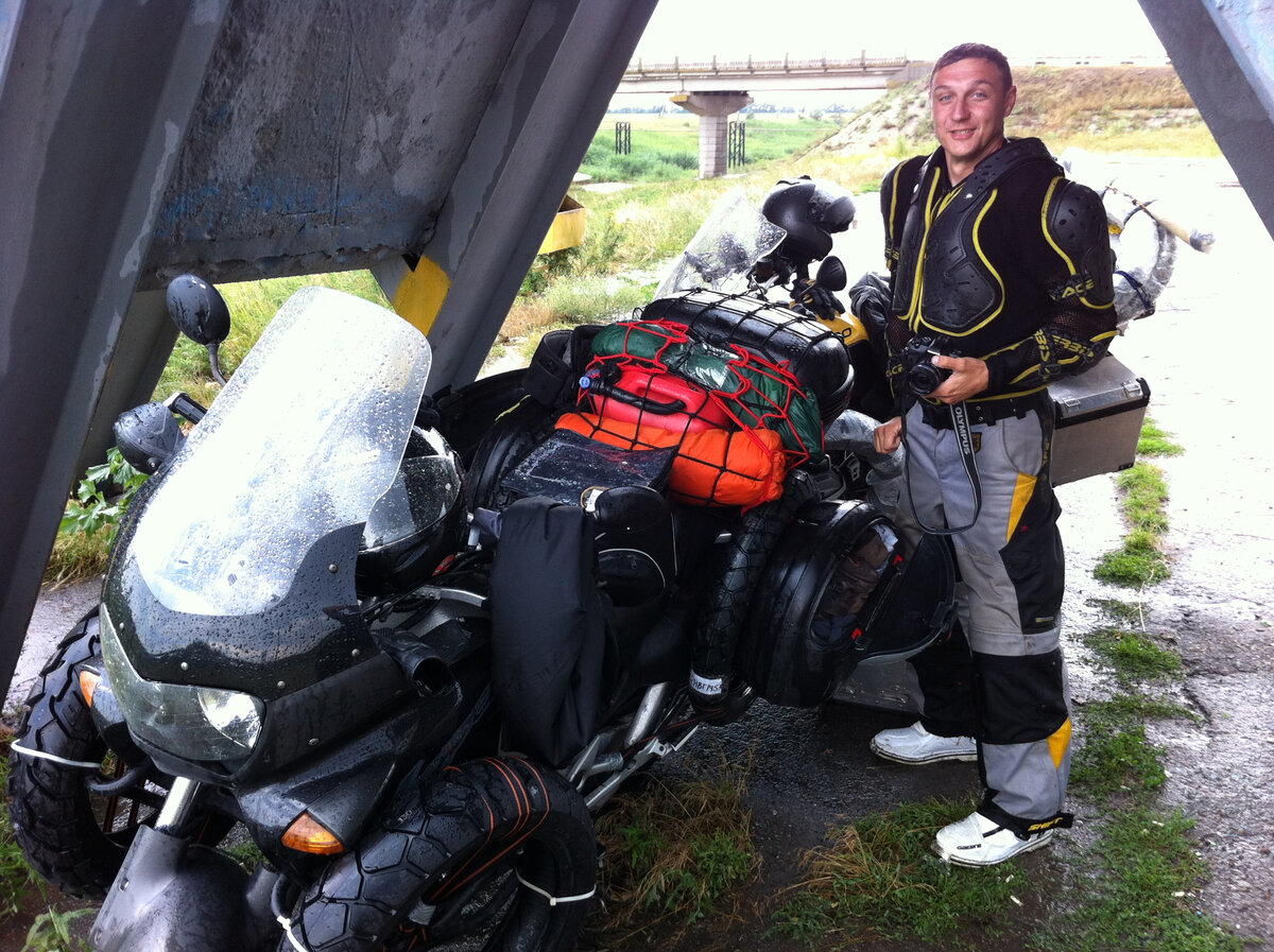 В надежде быстро выехать и скорее добраться до Самары, мы бодрячком проснулись, в этом нам помог «добрый» газонокосильщик, который рано утром приступил к своей работе. Сделали все свои утренние «дела» и выдвинулись в гараж за мотоциклами. Каково было наше негодование, когда Валерина хонда запела вчерашнюю песню! Где искать причину мыслей уже нет! Решив использовать время простоя с пользой, я натянул над своим мотоциклом веревку и устроил сушку одежды, намокшей под вчерашнем ливнем. После Волгограда дорога казалась узкой, плохой, нагруженной. Но выбора нет, и, общаясь по интеркому, мы двигаемся дальше. Ужинать остановились под Саратовом. Стало уже ясно, что до Самары мы сегодня уже не доедем. Местные жители рассказали, как проехать по объездной, дабы не плутать в городе. Одиноко стоявшие в темноте ГАИшники посоветовали нам для ночлега кемпинг в населенном пункте Маркс, рядом с б.о. Нива. Огромное им за это спасибо! Долго плутая по ночным приволжским дорогам, мы наконец нашли этот кемпин