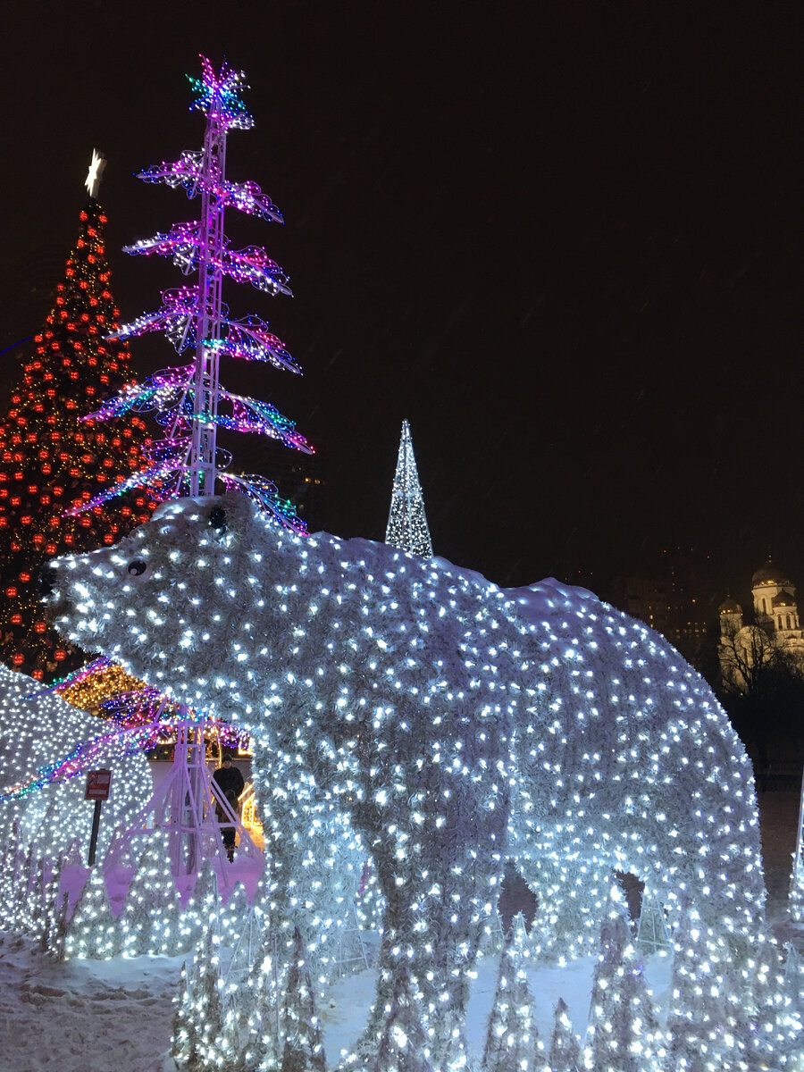 Белые полярные медведи, как известно, обитают на берегах Баренцева и Карского морей, на побережье Северного Ледовитого океана, в Гренландии и на Новой Земле, но небольшую популяцию белых медведей, точнее их светодиодных копий, можно в новогодние праздники встретить и в Москве. Световая инсталляция "Белые медведи" радует москвичей и гостей столицы уже не первый год. Есть у этой новогодней инсталляции и другое название - "Умка" - по любимому многими мультику, популярному у рождённых в СССР. Этот мультфильм был создан в 1969 году и сразу завоевал сердца зрителей благодаря удачно придуманному и нарисованному образу белого медвежонка и его мамы-медведицы. Союзмультфильм вскоре выпустил продолжение "Умка ищет друга". Колыбельная из этого мультика до сих пор любима, и популярна даже у современных мам. Зимой 2020 года "Умка" радовала гостей Парка Горького, а перед новогодними праздниками 2021 года вернулась к Ростокинскому акведуку по просьбе жителей Северо-Восточного административного округа