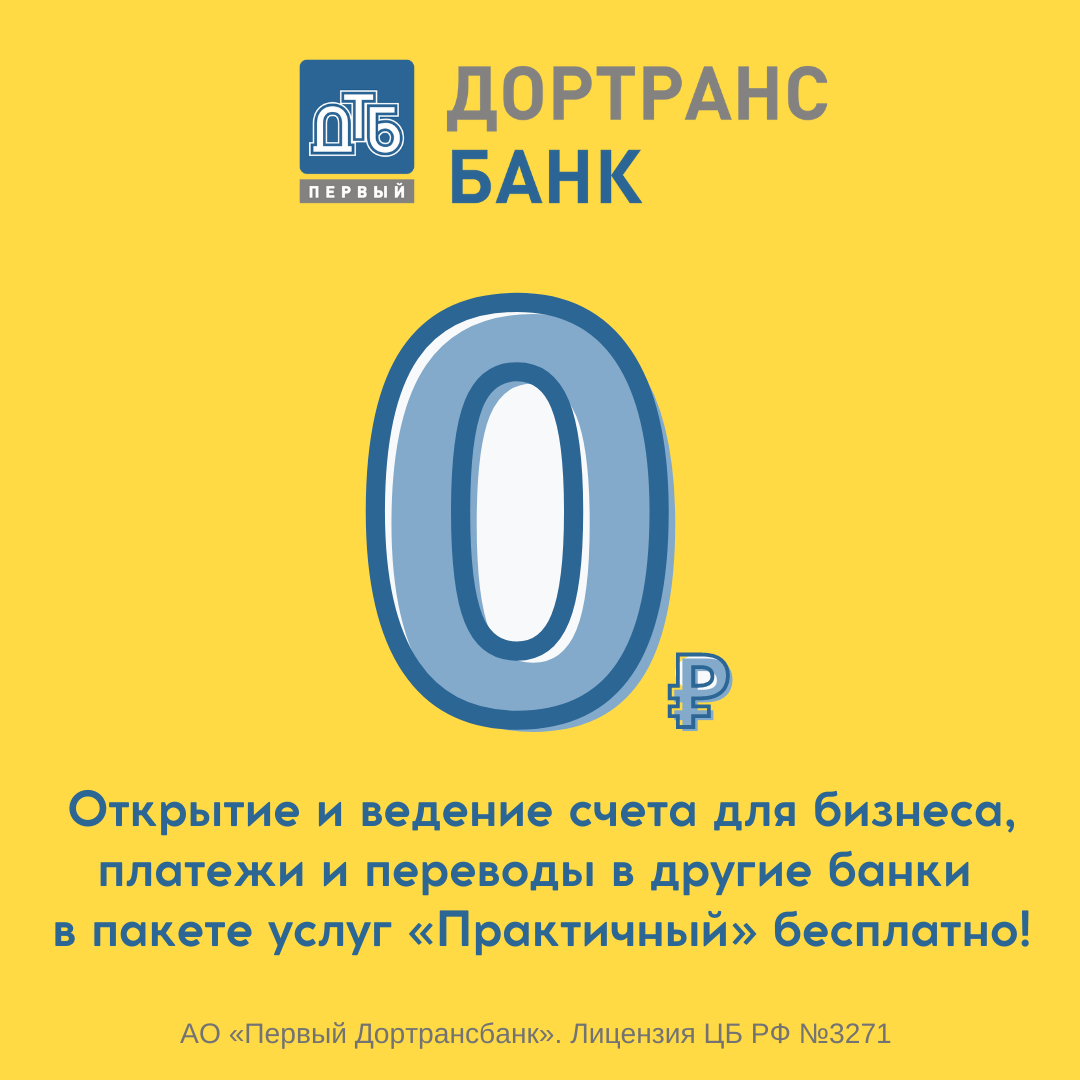 0 рублей расчетный счет для бизнеса в пакете услуг «Практичный» Дортрансбанка. Особые условия обслуживания: Управлять расчетным счетом легко 24/7 через интернет-банк и мобильное приложение Выпустим к счету бизнес-карту с бесплатным обслуживанием на весь срок её действия Оставьте заявку на открытие счета на нашем сайте. АО «Первый Дортрансбанк». Лицензия ЦБ РФ №3271