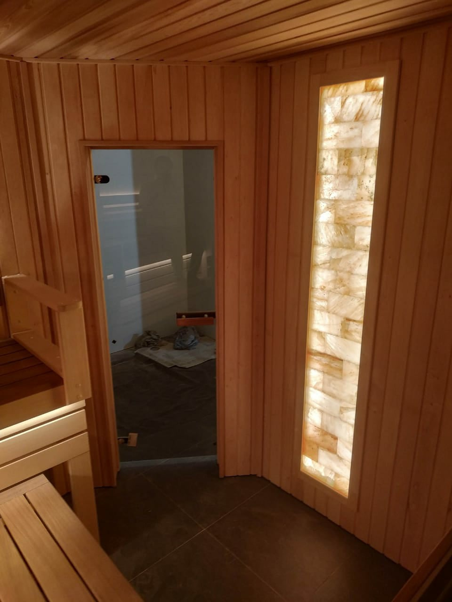 Гималайская cоль - это каменная розовая соль, которая обладает массой полезных свойств. О том, где её добывают, как используют и почему ценят, мы уже рассказывали в предыдущих постах. Гималайская соль кроме пользы для здоровья - это ещё и интересный вариант декора. Самые распространённые форматы - это большое панно на стенах, узкая полоска по периметру парной и светильники по углам. В своих проектах мы всегда подсвечиваем соль изнутри светодиодной подсветкой. Принципа монтажа у панно из гималайской соли два. Либо соль клеится на стекло и с внутренней стороны подсвечивается. Либо каркас будущего панно монтируется с помощью металлических профилей и направляющих. Высота каждого ряда должна равняться высоте соляного кирпича. Внутри каркаса прокладывается светодиодная лента. Все соляные блоки соли просматриваются и подгоняются под единый размер. В торцах каждого соляного кирпича уже сделаны специальные пазы, с помощью которых соль крепится к каркасу. Блоки монтируются по принципу кирпичной