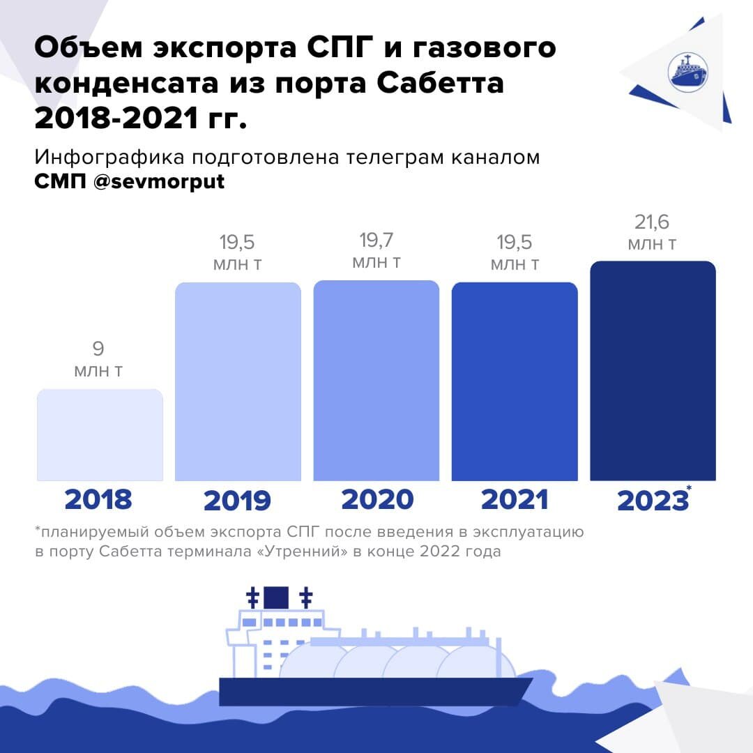 Первый танкер-газовоз прибыл в Сабетту в 2017 году, но это было лишь завершение ходовых испытаний. Основной экспорт начался с 2018 года. За этот год через порт было вывезено около 9 млн тонн СПГ и конденсата. Уже в следующем году экспорт удвоился и составил 19,5 млн тонн. В 2020-м, несмотря на пандемию, вывоз газа увеличился – до 19,7 млн тонн. В 2021 году экспорт газа и конденсата из Сабетты сохранился почти на том же уровне – 19,6 млн тонн.