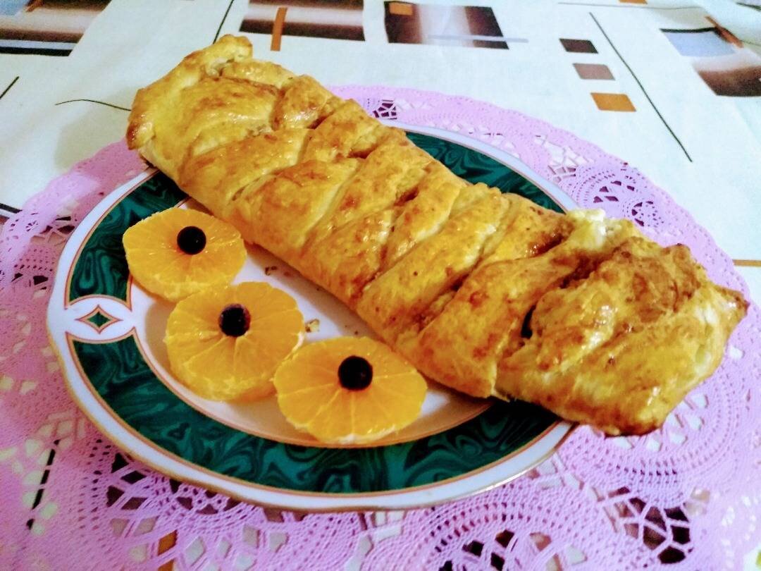Плетенка из слоеного теста с творогом и джемом