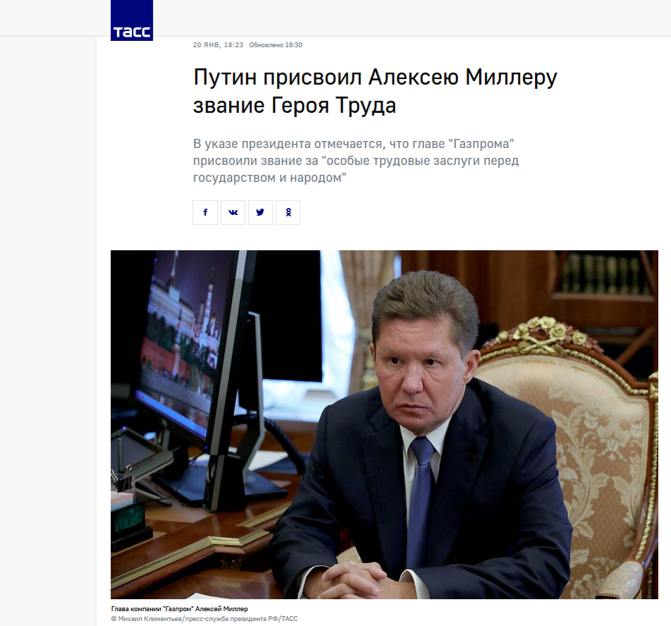 Конечно, оценки награждения Миллера званием Героя в основном оказались позитивными. (И это не удивительно в стране, где Газпрому и связанным с ним структурам принадлежит чертова прорва СМИ).