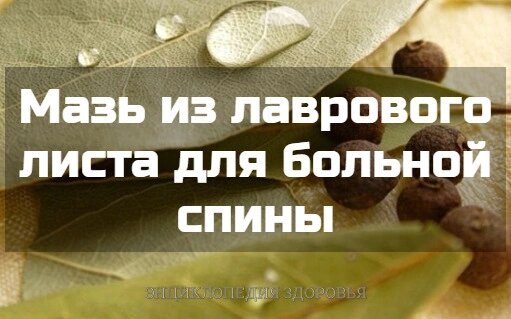 Мазь из лаврового листа для больной спины Именно остеохондроз является причиной боли в спине в 80% случаев Для тех, у кого застарелый остеохондроз. Лучше любых мазей из аптеки помогают средства на основе лаврового листа. Вот любимые рецепты: - Лавровое масло. Залить стаканом оливкового масла 1 ст. ложку мелко нарезанных лавровых листьев и настаивать 15 дней в теплом месте. Лучше всего втирать масло в больные места на ночь, а потом тепло укутываться. - Настой. Взять 1 ч. ложку измельченных листьев и залить 1,5 стакана кипятка. Настаивать в термосе 4 часа, процедить. Выпить эту дозу маленькими глотками за 12 часов. Курс лечения 4 дня.