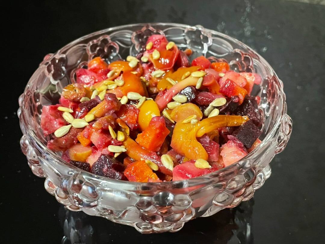 #кукпад4 Успехов и процветания ❤️ сообществу! Классический винегрет - частый гость на моей кухне, особенно в зимнее время, но вот винегрет с маринованными грибами готовила впервые 🤗 Я в восторге! Приготовьте такой винегрет, если конечно ещё не готовили. Очень вкусно!!! Ингредиенты: Чеснок, Тимьян (если есть в наличии), Свекла, Морковь, Картофель, Соль , Соленый огурец, Красный лук, Кунжутное масло (Ароматное), Маринованные опята, Горошек зелёный (по желанию), Семечки подсолнечные жареные Способ приготовления: Для приготовления этого салата необходимо сначала запечь овощи. На лист фольги выкладываем веточку тимьяна, половинку зубчика чеснока, свеклу. Свеклу солим, сбрызгиваем небольшим количеством подсолнечного масла и заворачиваем в фольгу. Морковь и картофель запекаем по такому же принципу, отдельно на других листах фольги. Овощи в фольге выкладываем на противень и отправляем в разогретую до 200 градусов духовку на 30 минут. Запеченные овощи очищаем от кожуры и нарезаем небольшими ку