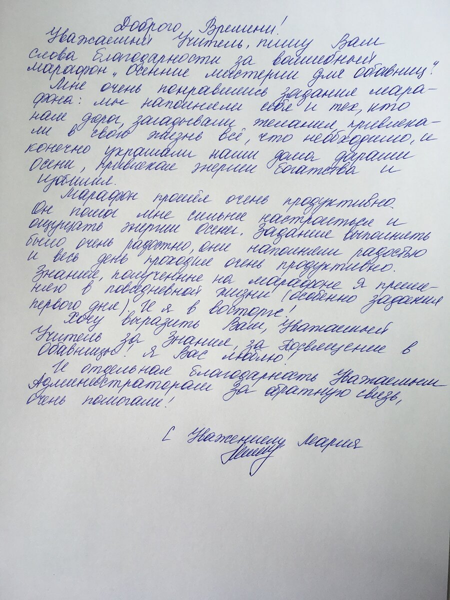 Марафон прошел очень продуктивно. Он помог мне сильнее настроиться и ощущать энергии осени. Задания выполнять было очень радостно, они наполняли радостью, и весь день проходил очень продуктивно.