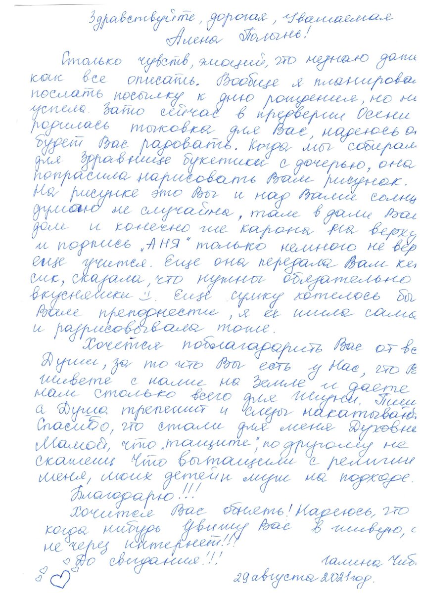 Столько чувств, эмоций, что не знаю даже, как все описать. Вообще я планировала послать посылку ко Дню рождения, но не успела. Зато сейчас, в преддверии осени, родилась тыковка для Вас, надеюсь, она будет Вас радовать. Когда мы собирали для Здравницы букетики с дочерью, она попросила нарисовать Вам рисунок. На рисунке — это Вы, и над Вами — солнце, думаю, не случайно, там вдали — Ваш дом и, конечно же, корона наверху и подпись «АНЯ», только немного неверно, еще учится. Еще она передала Вам кексик, сказала, что нужны обязательно вкусняшки. =) Еще сумку хотелось бы Вам преподнести, я ее шила сама и разрисовывала тоже.