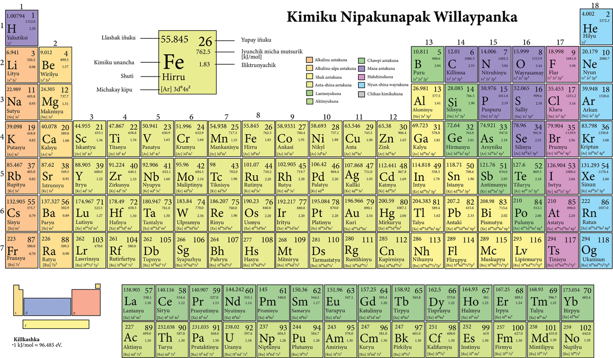 Периодическая таблица является частью основы химического образования. Студенты используют его для поиска таких значений, как атомная масса элемента, и он служит визуальным ориентиром для тенденций физических свойств. Но какой в этом смысл, если студент не может это прочитать? Исследователи попытались решить эту проблему для носителей кичва, языка, на котором говорят около полумиллиона человек в некоторых частях Эквадора, Колумбии и Перу. Kimiku Nipakunapak Willaypanka (периодическая таблица химических элементов) представляет слова кичва для всех 118 элементов и другие термины, такие как атомный вес. Исследователи говорят, что адаптированная периодическая таблица поможет носителям языка кичва выучить химию. «Мы думаем, что наука может быть частью кичуа, а кичуа может быть частью науки», — говорит Сантьяго Д. Гуалапуро-Гуалапуро, носитель языка кичуа и член команды. Исследователи начали свою адаптацию с перевода названий элементов на кичва разными способами. Для некоторых элементов, так