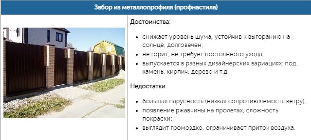 ПРОФНАСТИЛ (МЕТАЛЛОПРОФИЛЬ) - универсальный материал для надежного забора. Отлично защищает участок от посторонних глаз, злоумышленников. Рекомендуемая толщина профлиста для заполнения пролетов – от 0,5 мм, шаг между столбами — 2-2,5 м. Несмотря на недостатки, такой тип забора пользуется огромной популярностью, потому что качество и цена все же перевешивают любые его минусы. Что касается возведения конструкции, то она достаточно проста. К металлическим столбам приваривают поперечные лаги (металлические трубы) и затем крепят на них листы профнастила.