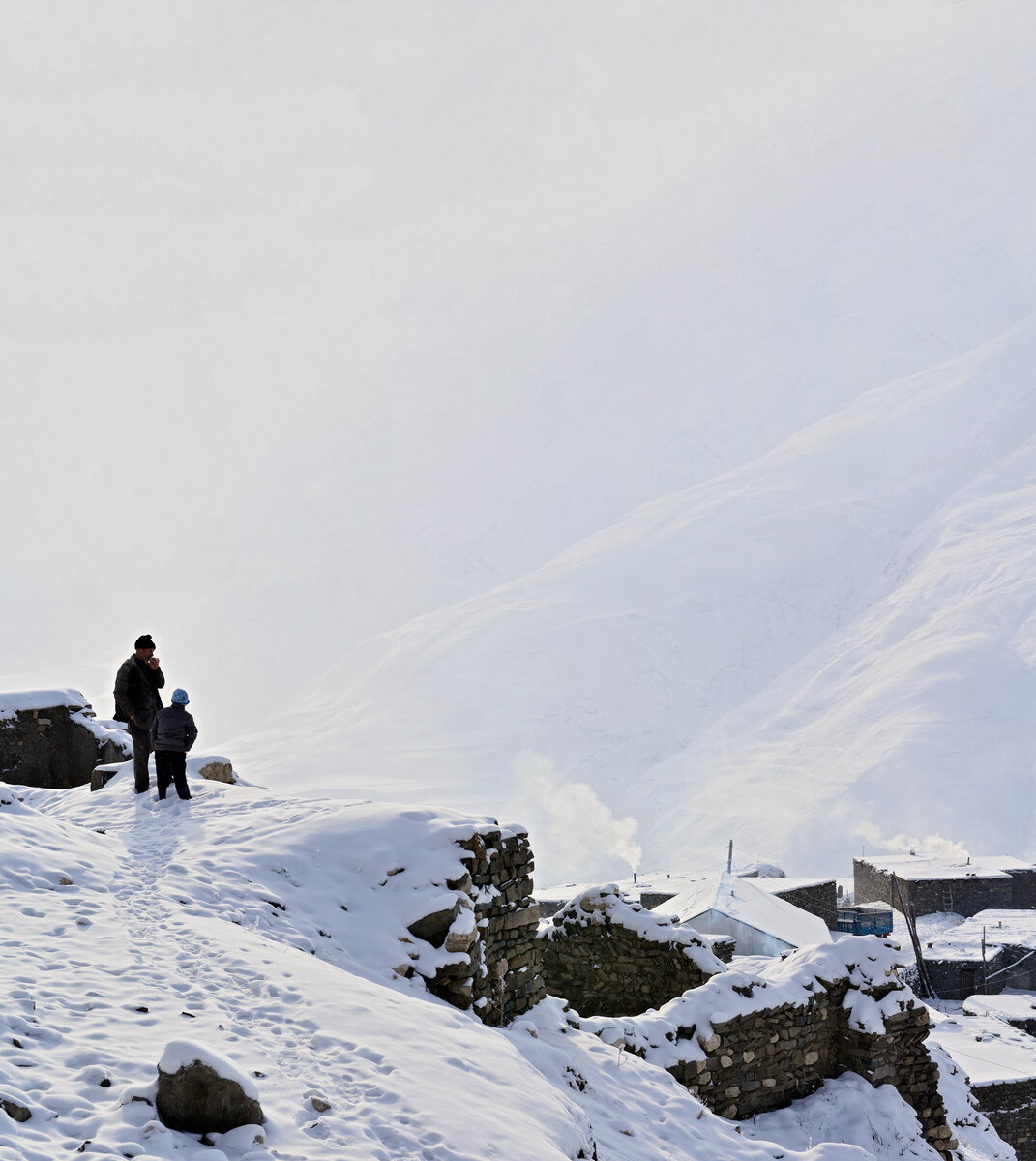 Утром двери некоторых домов оказались на треть заваленными снегом. Горы будто залиты белой масляной краской, снег заполнил все трещины и ложбинки на склонах. Преобразился и Хыналыг: на белоснежных крышах темные фигурки людей с лопатами счищают 40-сантиметровый слой снега. Вот она, мужская работа!