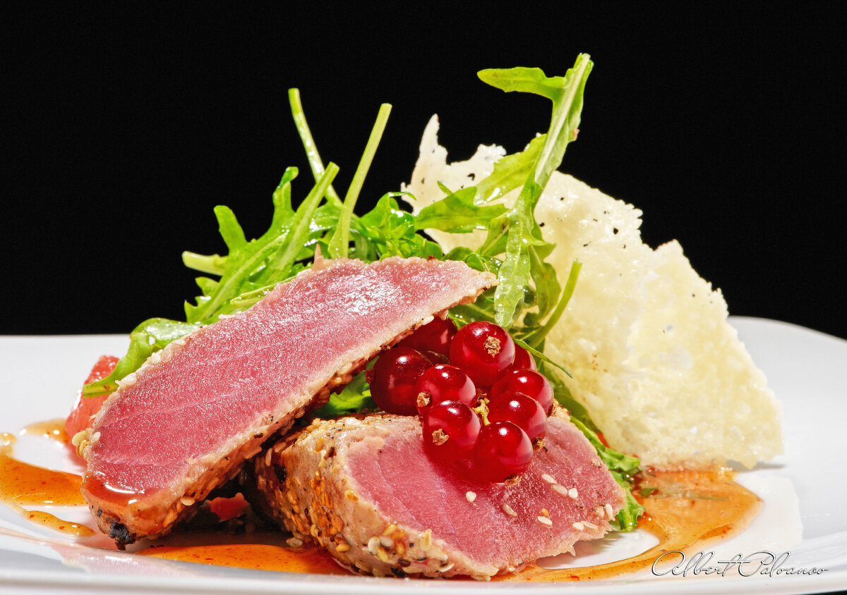 Татаки- японская техника приготовления рыбы и мяса!!! Очень вкусно из дичи-оленина или грудки дикой птицы!!! Ингредиенты: Тунец свежий, Кунжут белый, Масло растительное, Соль, перец, Руккола, Красная смородина, Соус сладкий чили Сен Сой, Сок лайма, Кунжутное масло нерафинированное, Соевый соус Способ приготовления: В первую очередь приготовьте соус, чтобы по готовности тунца, сразу подать блюдо к столу. Для этого смешайте в миске соус сладкий чили, соевый соус, кунжутное масло и сок лайма. Филе тунца помыть и тщательно обсушить бумажным полотенцем. Тунца посолить, поперчить и обвалять со всех сторон в семенах кунжута слегка прижав, что-бы семечки прилипли к рыбе. Разогреть сковороду-максимально. Обжарить тунца (в небольшом количестве растительного масла) в течение 1 минуты с каждой стороны. Не накрывайте сковороду крышкой!!! Татаки из тунца готово! Тунца положить на доску и наискось разрезать на две части острым ножом(если вы готовите закуску, а не основное блюдо на слайсы толщиной 1 –