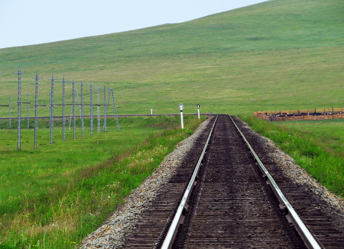 Это часть новой железной дороги Нарын - Газимурский Завод, проложенной в 2008-15 годах через старые Нерчинские рудники к новым ГОКам. На ней есть 5 станций, но пассажирского движения нет - это в чистом виде подъездной путь для вывоза полиметаллов. Для нас эта насыпь - как стена, отделяющая затерянный мир: здесь уходит почти параллельная трассе грунтовка в глубь степной долины, на которой стоят всего два села, дальнее из которых - Кондуй.