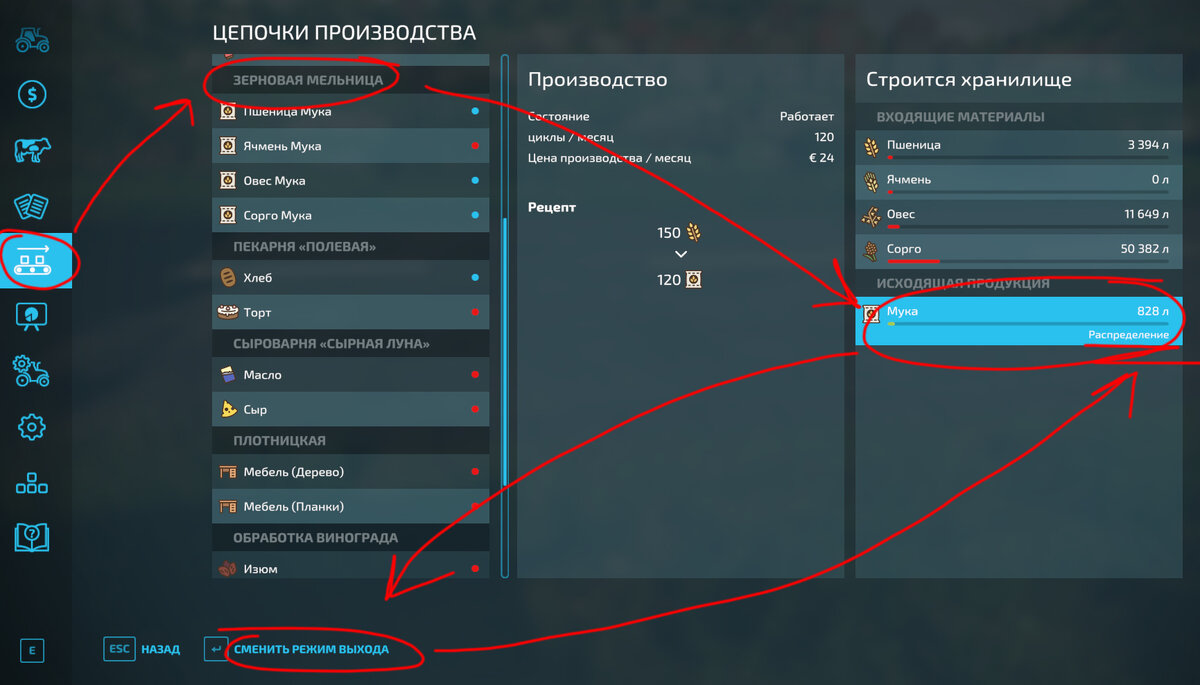 И давайте сразу уточним: если конечный продукт состоит из нескольких цепочек, удобнее в меню производства включать режим "Распределение". Например для производства хлеба нам нужна мука, которую мы будем производить из зерна на мельнице. Зерно на мельницу мы доставляем вручную, а вот муку с помощью функции распределения можно поставлять в пекарню автоматически, а не возить постоянно самому.