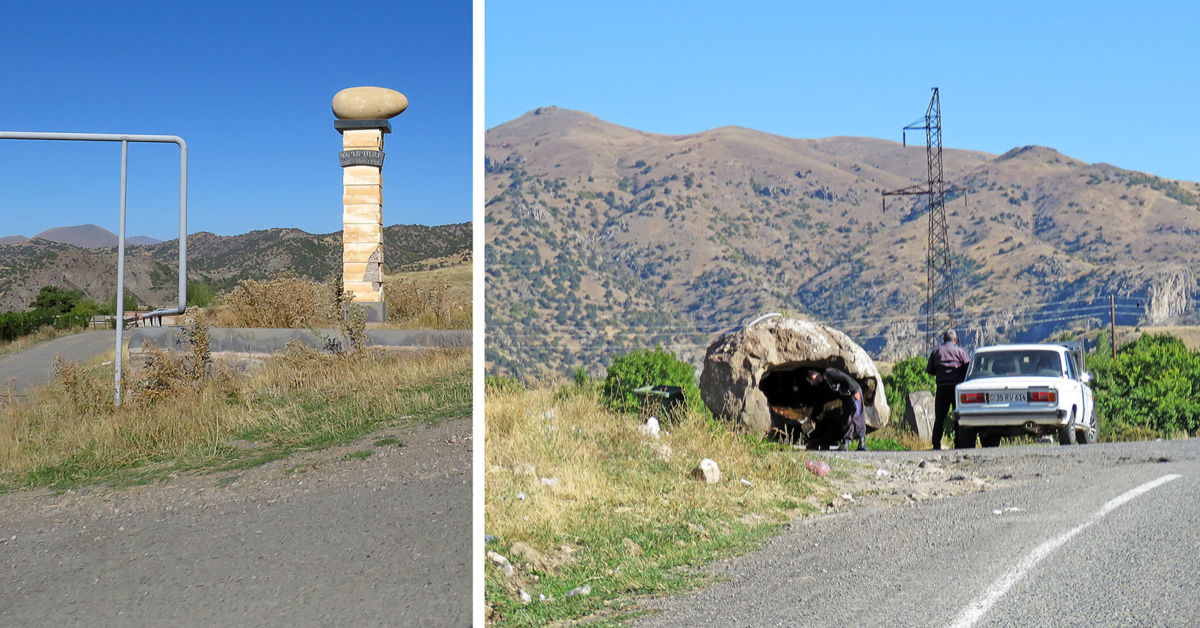 От поворота с иранской трассы до Джермука - ещё километров 30, но хороший асфальт и многочисленные инсталляции у обочин напоминают, что впереди - один из главных в стране курорт: