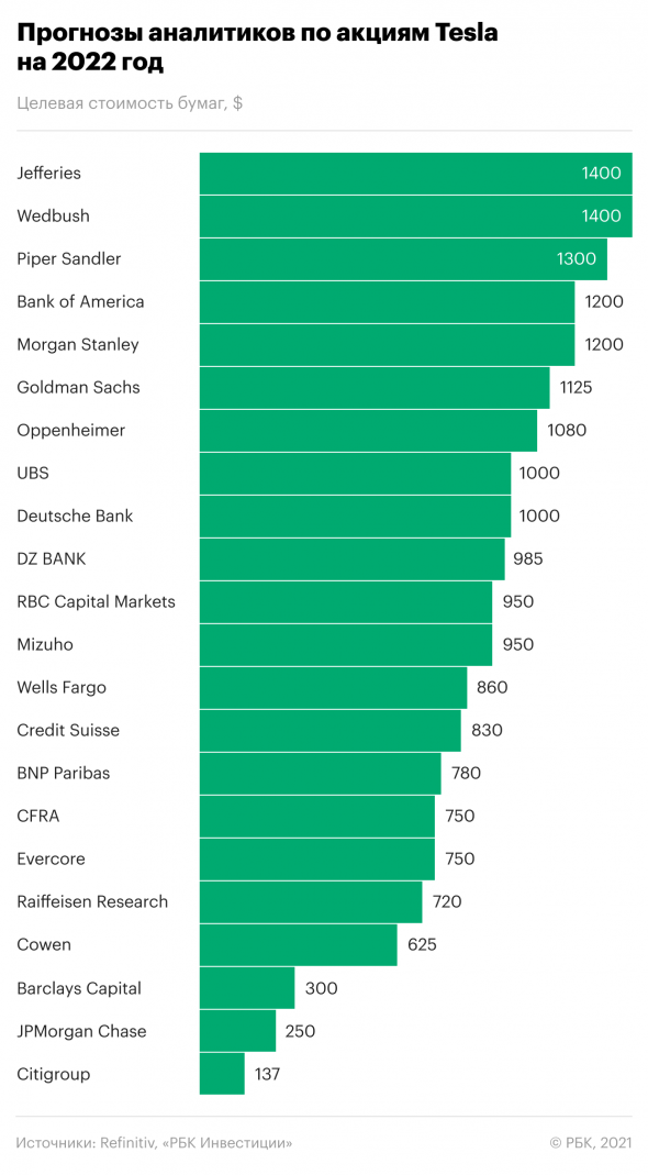 Эксперты крупнейших инвесткомпаний расходятся в оценках дальнейших перспектив бизнеса компании и динамики ее акций. Консенсус-прогноз опрошенных Refinitiv экспертов — $855 за бумагу, что подразумевает потенциал падения с текущих значений примерно на 18%. При этом 17 экспертов рекомендуют покупать бумаги, 13 — держать в портфеле, а еще десять советуют продать бумаги производителя электрокаров.