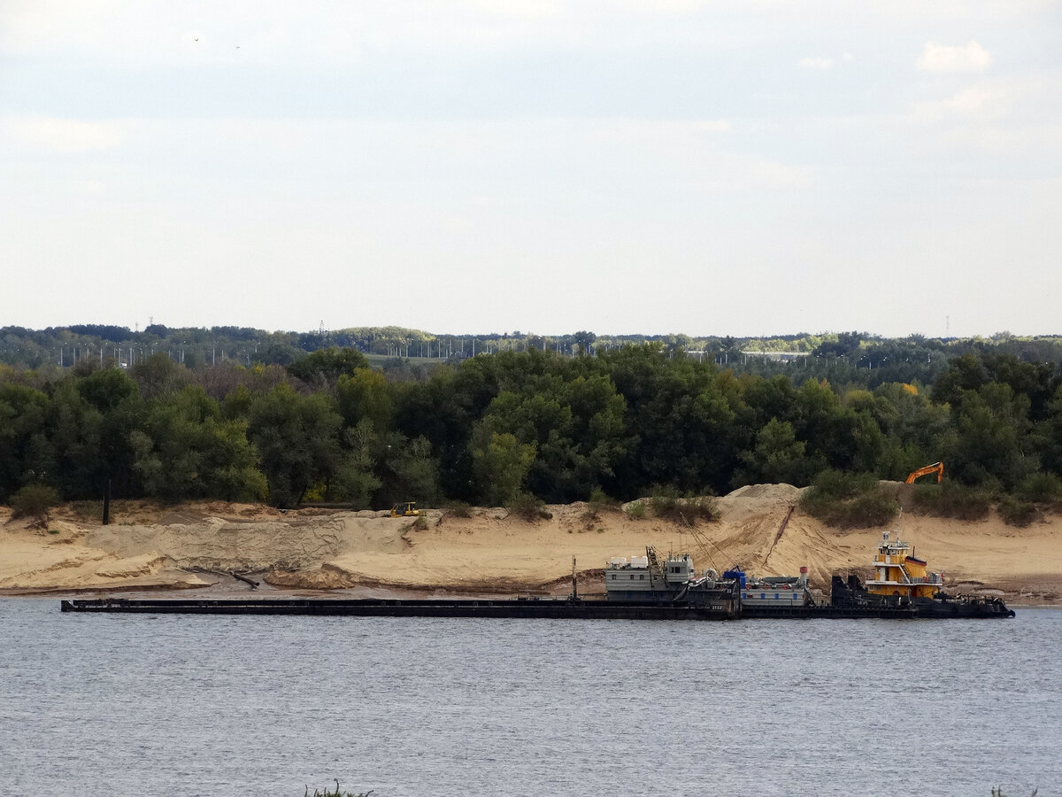 Осенью прошлого года мне довелось стать очевидцем обычного, в общем-то, процесса. А именно добычи песка со дна Волги. Всё происходило почти в самом центре города, напротив ЦПКиО. На берегу Волги у хутора Бобры стоял земснаряд и выкачивал поднятый со дна песок на берег. Это были не просто работы по расчистке русла. Намытый со дна реки песок используется для строительства трассы через Волго-Ахтубинскую пойму, а также при укреплении берега Волги в черте Волгограда. То, что песок используется для строительства трассы, знаю от знакомых, которые неоднократно видели самосвалы с песком, идущие от Бобров в сторону новой трассы. Логичное решение. Песка на стройке требуется много, а на дне Волги его в избытке. Ещё и дно расчистят. Двойная польза. Песка было намыто довольно много. На месте гор песка, что на фото ниже, когда-то был большой котлован, который заливало водой во время паводков. В этом году уже не зальёт. На месте котлована выросли горы. Остатки бывшего котлована. Сейчас, наверное, и