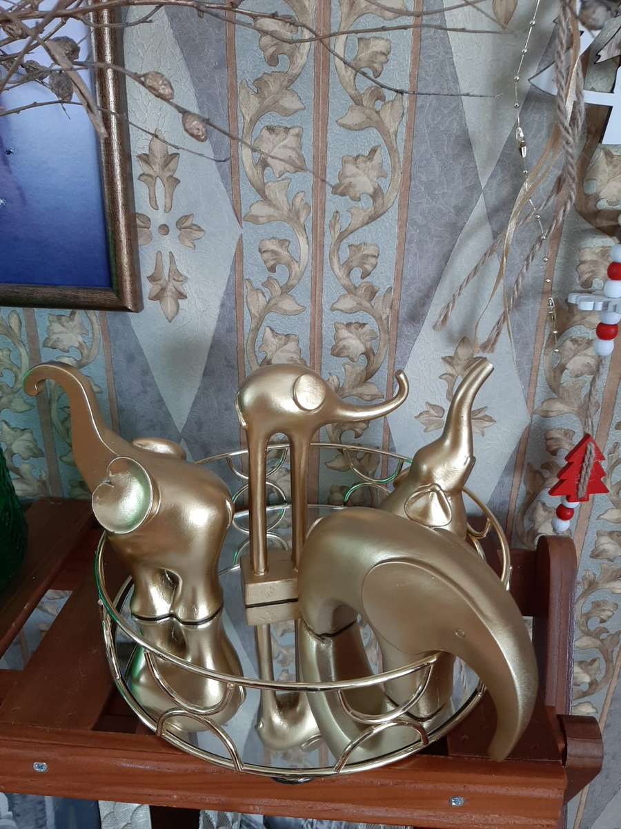 Золотой поднос с зеркальным дном (199 р.) и слоники на нем. Слоники стоили по 99 р. В обзорах блогеров видела разные способы применения этого подноса: для хранения духов, косметики, украшений. В качестве подставки для свечей и др. Но я решила поставить на него слоников. По-моему, вписались отлично )