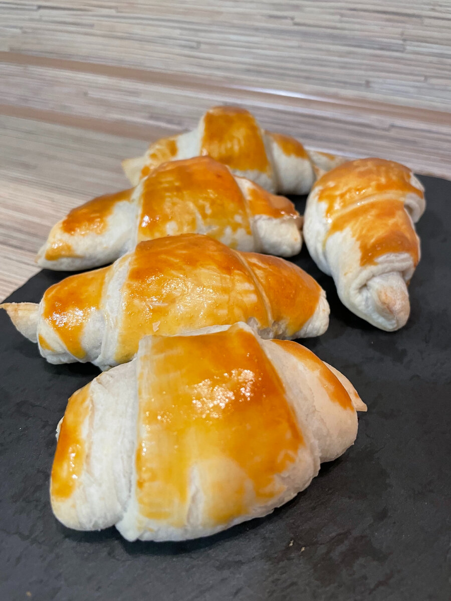 Всем привет, дорогие друзья! Сегодня снова будем готовить сладкий и быстрый десерт из слоеного теста! В чем прелесть этого рецепта? В том, что готовить не надо ни тесто, ни начинку! Выпечка из слоенного теста всегда получается очень вкусная и воздушная. Для приготовления нам понадобятся следующие ингредиенты: Да, в моем рецепте всего лишь 3 ингредиента. Вместо нутеллы можно использовать шоколадную плитку, варенье или джем. Из данного количества ингредиентов получается 6 круассанов. Итак, приступим к приготовлению Шаг 1. Тесто предварительно разморозить при комнатной температуре. Обычно это занимает 15-20 минут времени. Шаг 2. Размороженное тесто раскатываем в пласт толщиной где-то 4-5 мм. Шаг 3. Нарезаем тесто на длинные треугольники, как показано на фото Шаг 4. На самую короткую сторону треугольника выкладываем нашу начинку. У меня это нутелла. Шаг 5. Затем сворачиваем круассаны, как рогалики. Плотно прижимаем тесто. Шаг 6. Полученные круассаны смазываем взбитым желтком,