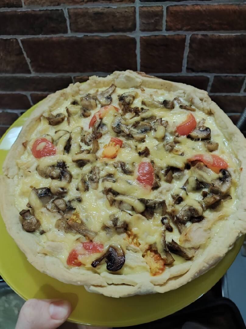 #меню Ингредиенты: Тесто: , Масло, Вода , Мука , Начинка, Грибы шампиньоны, Лук , Курица вареная , Помидор для украшения, Заливка, Сметана, яйца, Соль, Сыр Способ приготовления: Тесто: масло потереть на тёрке, смешать в крошку с мукой, добавить воду и соль Замесить тесто В холодильник на 20 мин Раскатать в форму (протыкать тесто вилкой, чтоб сильно не поднялось) и выпекать 180/20 мин Начинка: лук нарезать кубиками, поджарить на сковороде туда же нарезанные не мелко грибы, жарить до готовности Когда корж готов Выкладываем на него курицу(порезанную на мелкой кубик) грибы с луком и заливаем заливкой(просто смешать яйца, сметану и натернэтый мелко сыр) Сверху украсить помидорами Выпекать 180/30м