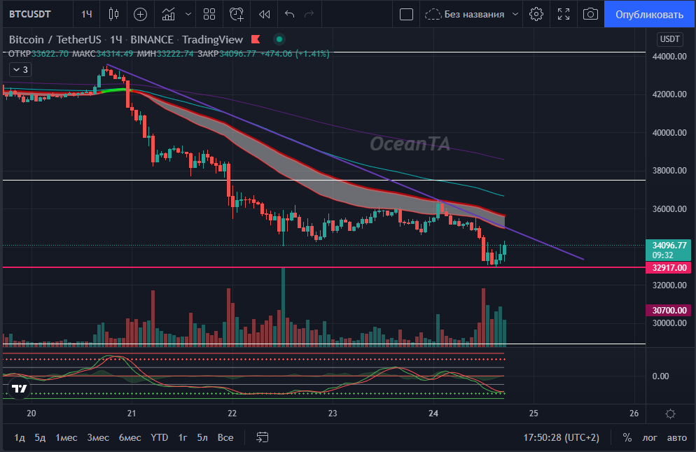 Вчерашняя аналитика пока в отработке - 34000 выбили, бычий дивер на 6ч RSI рисуем на данный момент. Что нужно для подтверждения отскока? Хотелось бы увидеть закрытие дневки хорошим пин-баром - в зоне 34500-35000. Это было бы прекрасно. Что очень напрягает - это потенциальное продолжение падения индексов США, т.к фьючерс S&P500 уже торгуется в минусе более 1% сегодня. Продолжается какое-то сумасшедшее усиление военной риторики - даже меня уже мысли какие-то посещают не самые приятные на этот счёт и работаю в не самом приятном расположении духа, если честно. В общем, ждём покупателя и только после получения подтверждения будет смысл искать вход для новой сделки. А пока этого нет - можем падать в зону 32000-30000 спокойно, как я описал в посте BTC-Глобальная картина. Биткоин в данный момент идёт против фонды - пошли уверенные покупки. Даже перевыполняются условия(закрытие дневки в зоне 34500-35000), которые я ставил для потенциальных покупок - сейчас уже выше 35000 ушли. Это значит, что