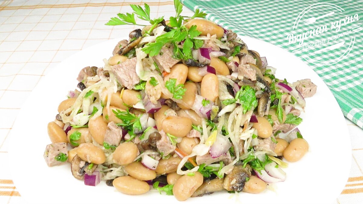 Мясной салат с шампиньонами и фасолью. Делюсь рецептом