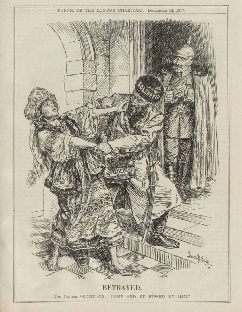 1. Историк Сергей Цветков приводит карикатуру на большевистский Октябрьский переворот из британского сатирического журнала «Панч». Подпись к карикатуре: «Предательство» («Предана»). Похоже, союзники России в Первой мировой войне не особенно сомневались, на чьи деньги и в чьих интересах большевики устроили свою революцию:
