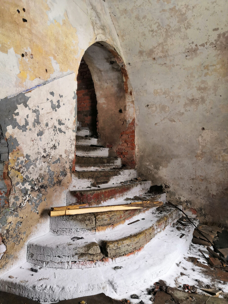 "Нам сюда." — Брат показал на вход, завешенный несвежим ковром, который должен был заменить дверь. Я заколебалась. Давно заброшенная казарма выглядела пристанищем бездомных, встречаться с которыми на их территории совсем не хотелось. Но любопытство перевесило и, брезгливо отодвинув ковёр, мы проскользнули внутрь. "Да, бомжи здесь точно есть... или были" — сказала я, зажав нос. Дышать на первом этаже было невозможно и мы поторопились наверх. Сам вход в здание впечатлил. Необычная архитектура - арки, закругленные ступени, и вся эта красота в таком состоянии... Вскоре стало понятно, что людей в здании нет. Остались только следы их пребывания, да объявления "работа с проживанием" и "общежитие за копейки". По всем этажам гуляли сквозняки, через дыры в крыше падал снег, а вокруг высились ледяные сталактиты-сталагмиты. Однако, перемещаться по зданию оказалось небезопасно. То и дело на пути возникали то лифтовые шахты с открытыми настежь дверьми, то балконы лестниц, покрытые скользким ль