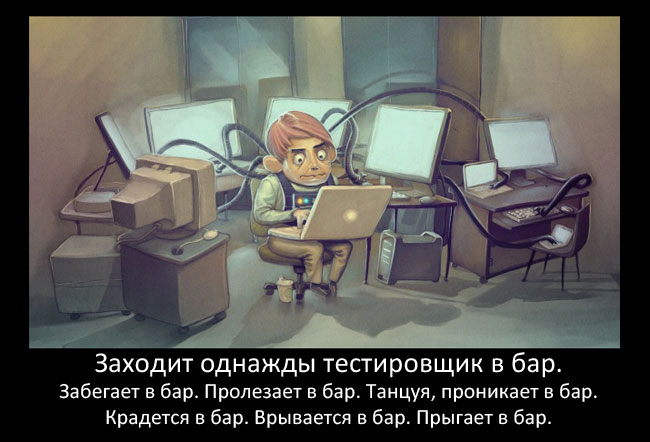 - В поезде едут 3 юзера и 3 программиста. У юзеров 3 билета, у программистов 1. Заходит контроллер. Юзеры показывают билеты, программисты прячутся в туалет. Контроллер стучится в туалет, оттуда высовывается рука с билетом. Программисты едут дальше. На обратном пути. У юзеров 1 билет, у программистов ни одного. Заходит контроллер. Юзеры прячутся в туалет. Один из программистов стучит, из туалета высовывается рука с билетом. Программисты забирают билет и прячутся в соседний туалет. Юзеров ссаживают с поезда. Вывод — не всякий алгоритм, доступный программисту, доступен юзеру.