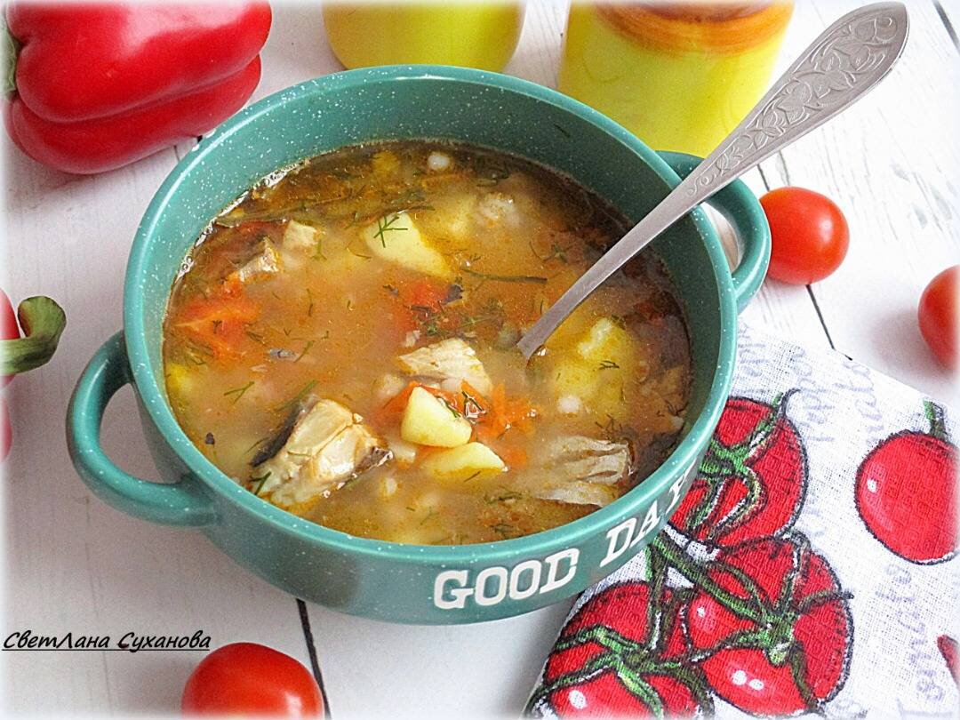 Вкусный, легкий, ароматный суп. Ингредиенты: Понадобится на кастрюлю объёмом 4 литра:, перловка-, консервы рыбные, картофель, морковь, луковица крупная, помидор, зелень укропа и петрушки, растительное масло для жарки , лаврушка, соль, черный перец Способ приготовления: Воду вскипятить и положить картофель,нарезанный кубиками и хорошо промытую перловку, посолить и кинуть лавровый лист. (я для супов всегда варю перловку заранее в большом количестве воды и после готовности промываю холодной водой). Сделать зажарку: на сковороде поджарить лук до золотистого цвета, затем добавить натертую на крупной терке морковь, после помидоры кубиками. Протушить две минуты и выложить зажарку в суп. Затем положить готовую перловку (если варили её отдельно, как я) и консервы. Поперчить, попробовать на соль. В конце положить мелко рубленную зелень и после закипания, выключить плиту.
