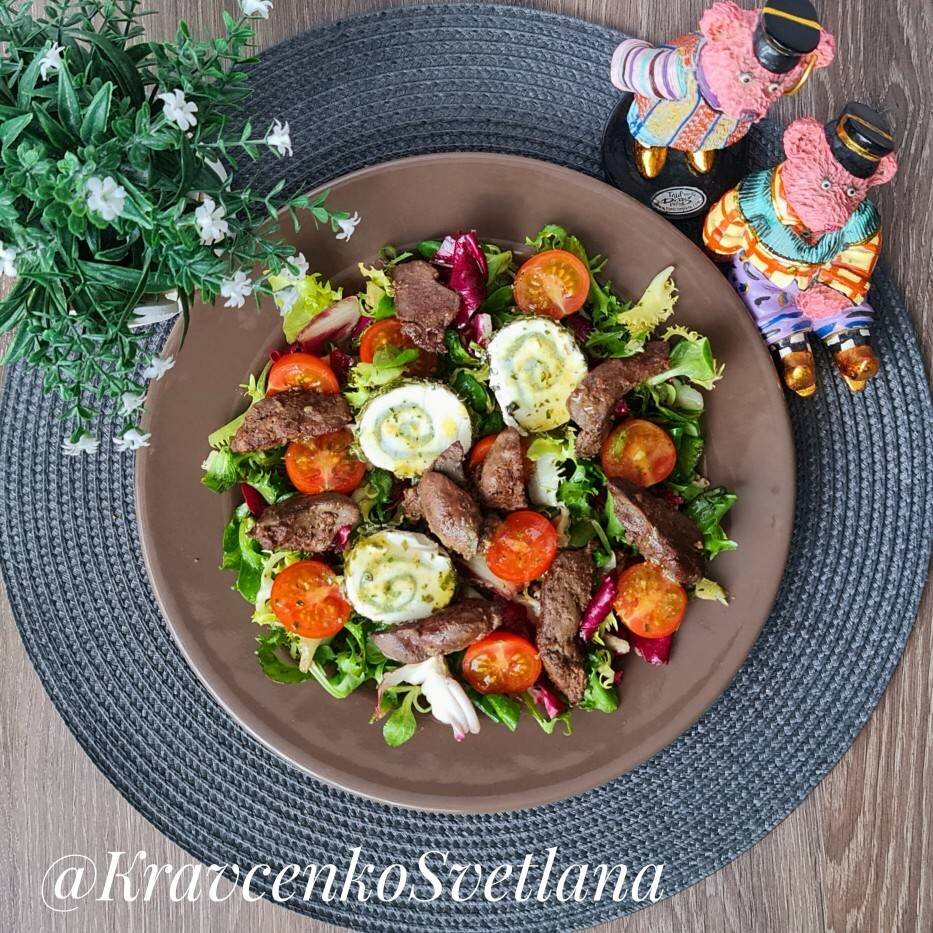 #кукпад4 Желаю всем творческого вдохновения, великолепных блюд и самых вкусных рецептов! Сытный и вкусный салат, который готовится очень быстро. Чудесен в качестве легкого ужина или перекуса. За вдохновение спасибо @musatova_elena1980 Ингредиенты: салатный микс, томаты черри, сыр (мягкий с зеленью), куриная печень, чеснок, заправка для салата:, - оливковое масло, - соевый соус, - бальзамический уксус, соль, перец, специи Способ приготовления: Предварительно обжариваем печень до готовности. Подготовим продукты для салата. Для заправки смешаем необходимые ингредиенты. Выкладываем салатный микс, сверху томаты черри, кружочки сыра, кусочки теплой куриной печени, поливаем салат заправкой и сразу подаем. Приятного аппетита!