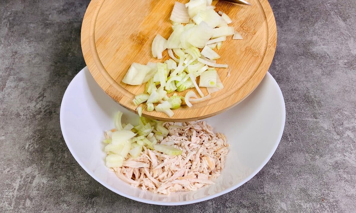 1. Отварную куриную грудку разделываем на волокна и отправляем в салатник. К ней добавляем нарезанный репчатый лук. 2. Один из основных ингредиентов - яичные блинчики. Берём яйцо, щепотку соли, взбиваем и жарим на растительном масле. У меня 1 блинчик = 1 яйцу. А всего на салат понадобится 3 блинчика. 3. Остывшие блинчики нарезаем на полоски и отправляем к остальным ингредиентам. 4. Молодой кабачок и огурец нарезаем соломкой.