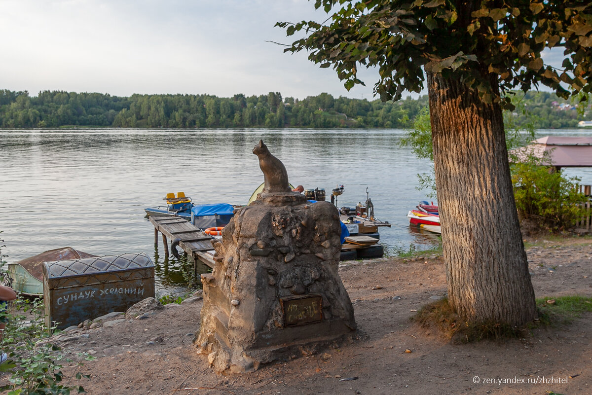 Памятник кошке — одна из достопримечательностей Плёса. Кошка сидит и задумчиво смотрит на Волгу. Скульптура находится на набережной. Сюда приходят туристы сфотографироваться и загадать что-нибудь около стоящего рядом сундука желаний. На самом деле, история появления этого памятника очень грустная. Кошка Муха была любимицей художника Виталия Панченко, жившего неподалеку. Она трагически погибла, спасая своих котят от дворового пса. Память кошке решили увековечить. Скульптуру кошки изготовил белорусский скульптор Олег Илларионов, товарищ художника из Плёса. Памятник кошке Мухе установили на постаменте, где когда-то стояла давно утраченная скульптура девушки с веслом. Сейчас памятник кошке Мухе воспринимается не как посвящение конкретной кошке, а как памятник всем питомцам. А кошек сейчас в Плёсе хватает, надеюсь вопрос с агрессивными дворовыми собаками здесь решили. Ещё статьи о Плёсе: