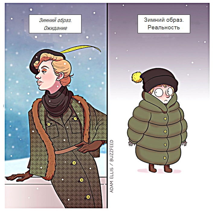 Немного о причёсках, макияже и нарядах. Что будет, если повторить образ из интернета? Модный лук на дому или шутовской наряд. Кто же не знает, про покупки онлайн-вещей, которые не оправдали ожиданий. Кстати, хорошо выглядеть хотят не только девушки, но и парни. Мнение сильной половины покажет на своём примере Адам Эллис, мастер иронии и создатель забавных комиксов. Он ведёт свой #юмор - блог уже несколько лет с 2010 г. В серии "Книга Адама" немало популярных историй. Найти истории от Эллиса можно в Инстаграме художника, а также на Патреоне, Фейсбуке (на русском языке на сайте «Авторский комикс»). Ранее на канале были #комиксы от принцессах в видении Эллиса: А сегодня вас ждут жизненные и смешные комиксы о модных тенденциях! Зимняя мода Иногда Адам использует парные картинки - сравнения. Для темы про моду или внешность это довольно актуально. Вот можно ли выглядеть хорошо и стильно зимой в сибирские морозы? Тут приходится укутываться потеплее, когда большую часть зимы на улице -20, а то